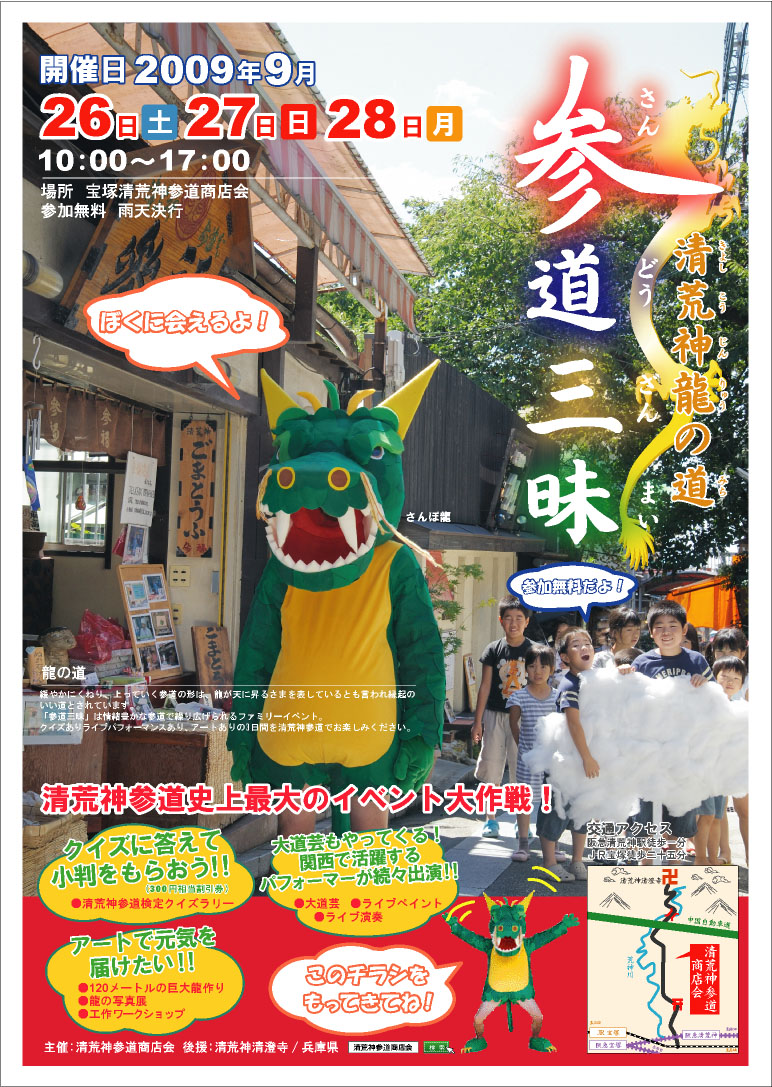 参道三昧とは毎月第三日曜日に開催される「荒神参道まつり」で行われるステージ(大道芸や野外コンサート)の拡充に加え、清荒神参道検定や120mの巨大龍作り等々盛りだくさんで開催したいと思います。